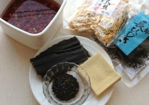 小豆、黒豆、高野豆腐、乾物(ヒジキ、干し椎茸、切り干し大根など)